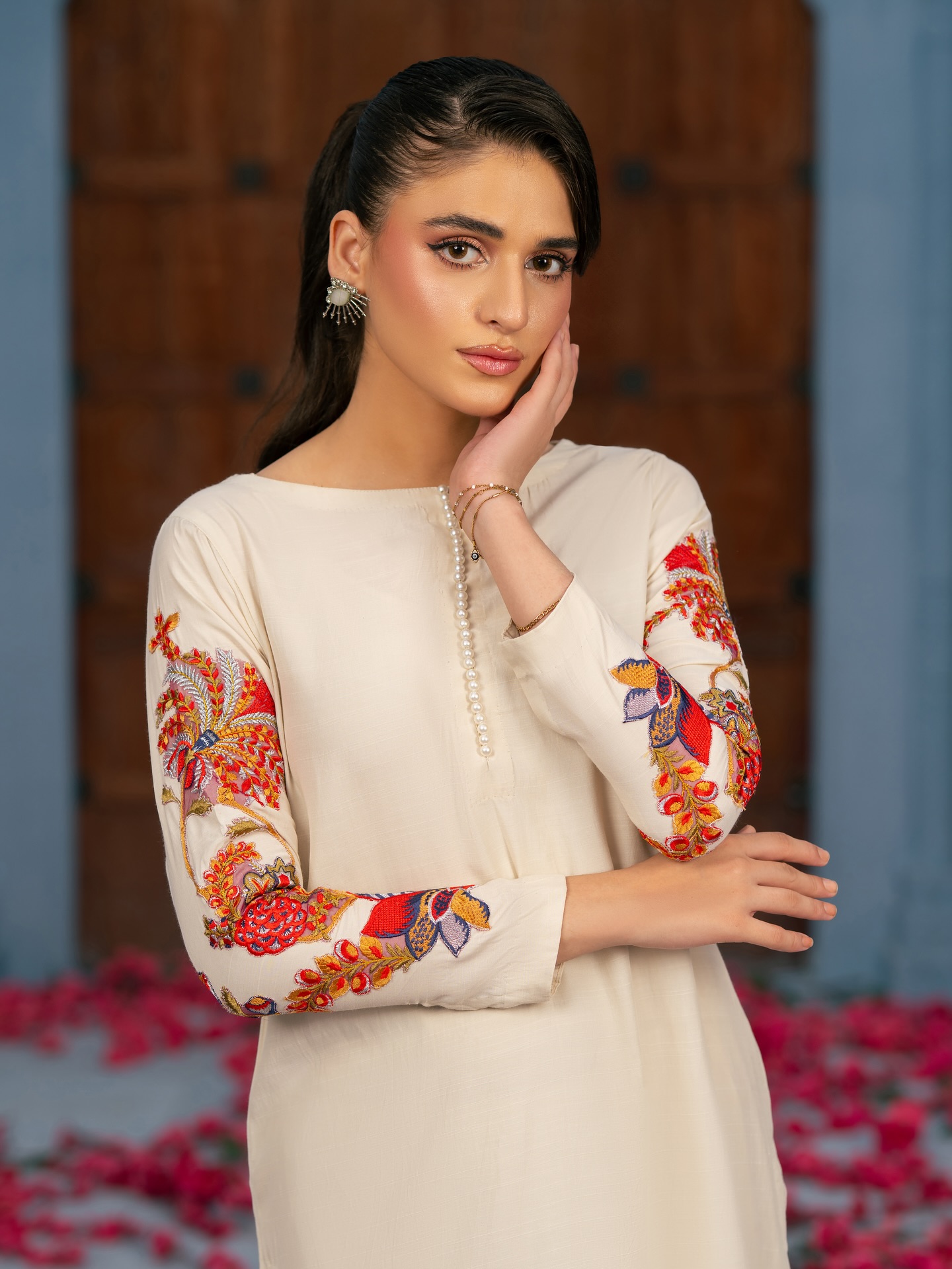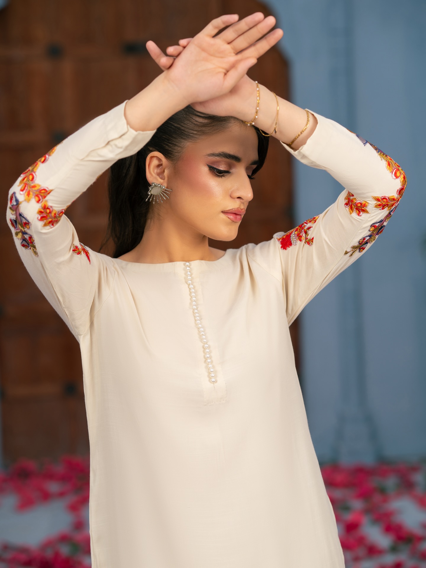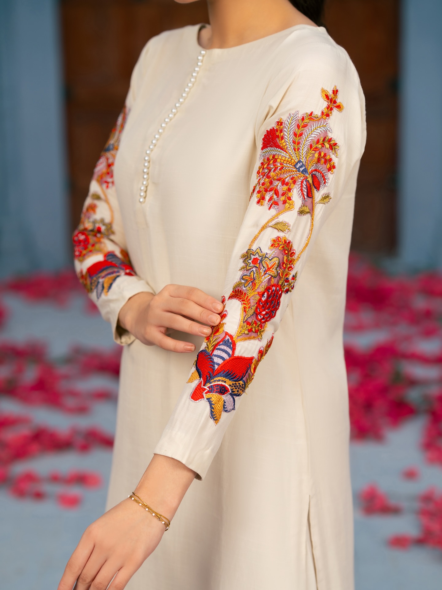 - Kameez: Luxurious ivory raw silk fabric with breathtaking floral patch embroidery in vibrant red, yellow, blue, and green threads on the full sleeves. The round neckline is adorned with elegant pearls for a subtle, royal shimmer.