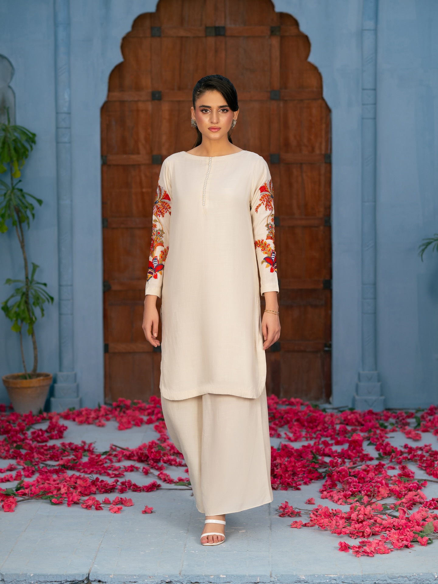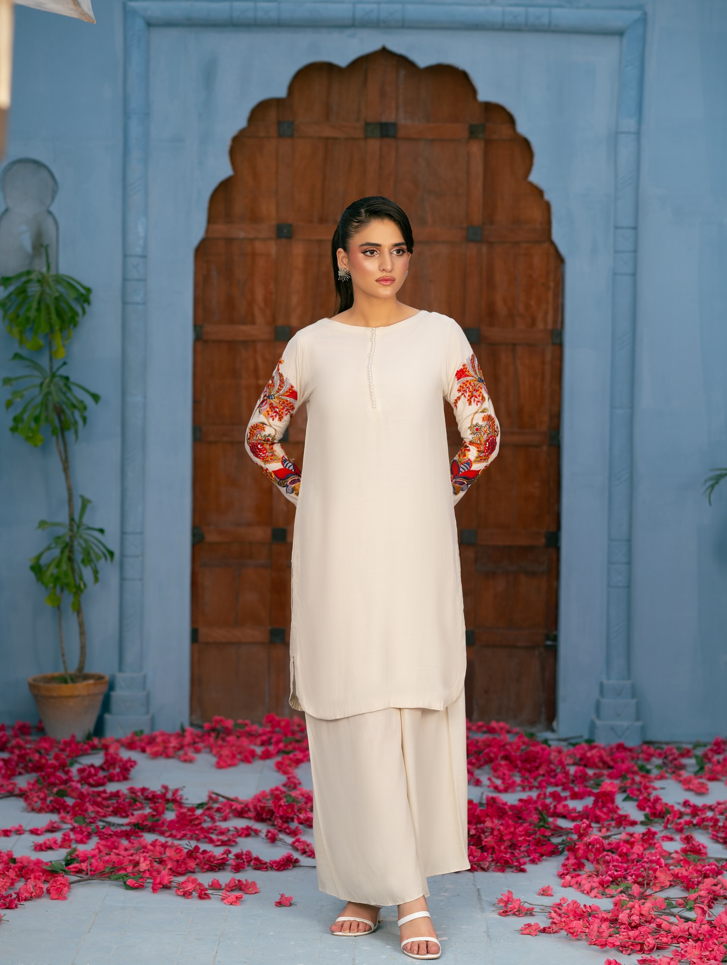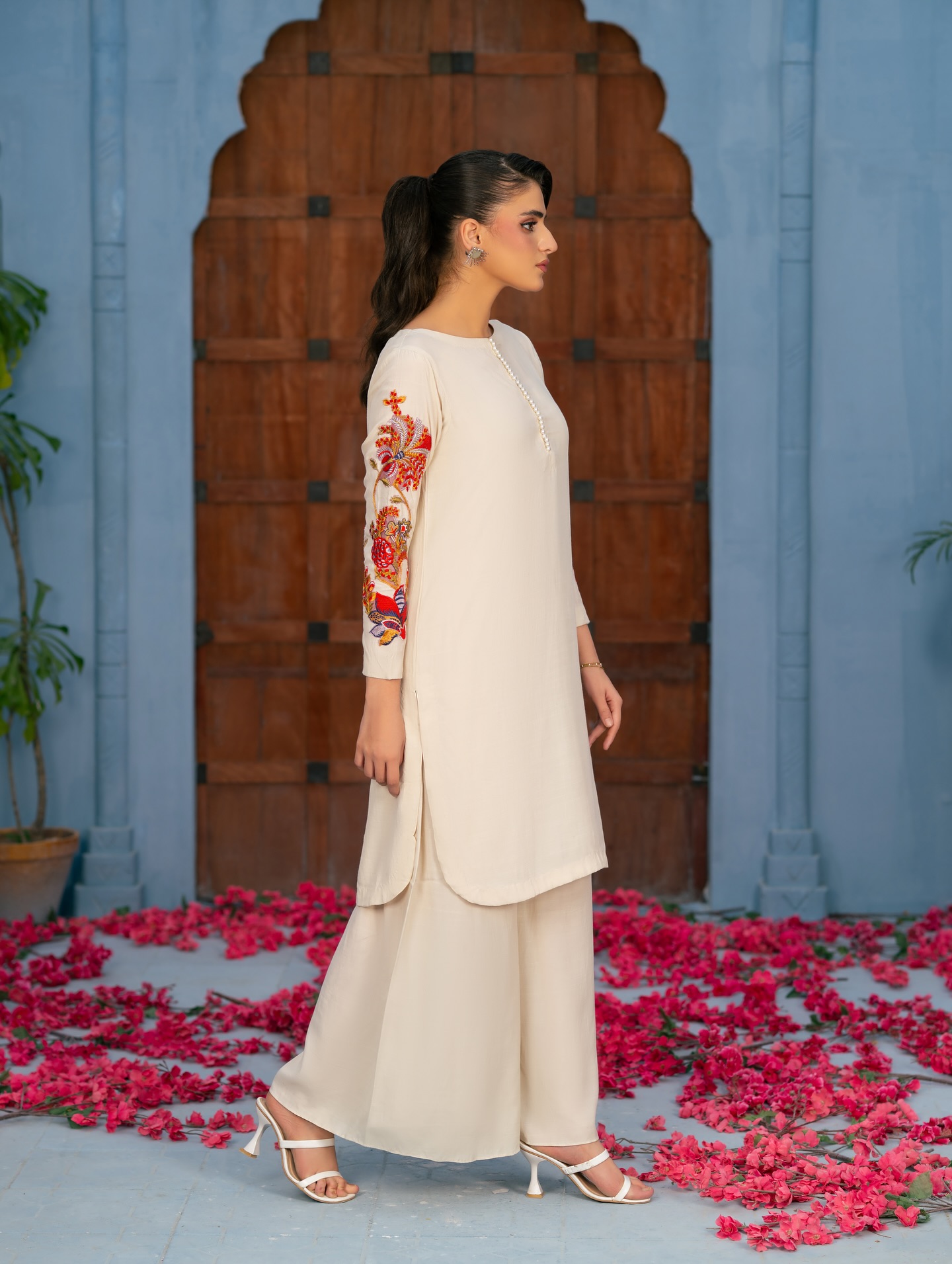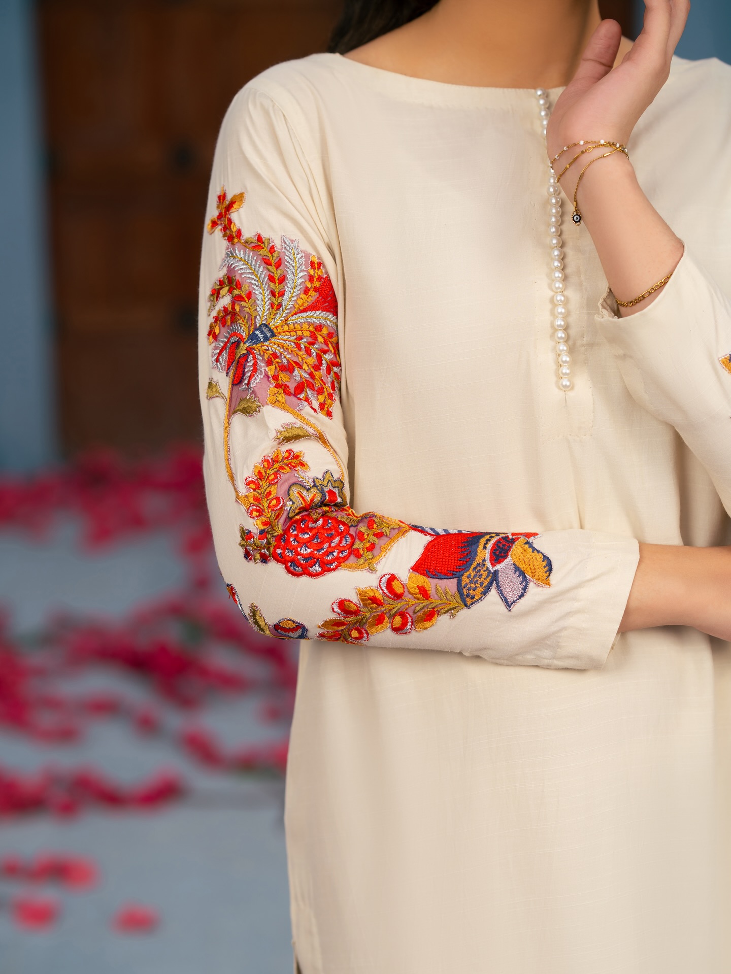 - Kameez: Luxurious ivory raw silk fabric with breathtaking floral patch embroidery in vibrant red, yellow, blue, and green threads on the full sleeves. The round neckline is adorned with elegant pearls for a subtle, royal shimmer.