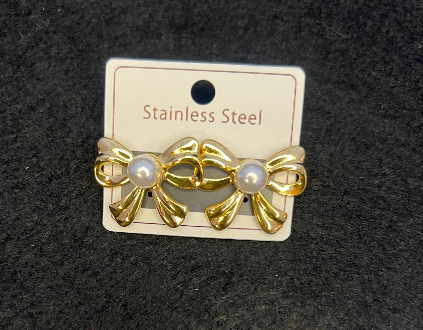 Tie your look together with these delightful gold bow stainless steel stud earrings – a charming blend of classic ribbon design and modern durability. Each bow is meticulously crafted with flowing loops and tails in gleaming gold-plated stainless steel, centered by a creamy faux pearl that adds a soft, elegant glow.