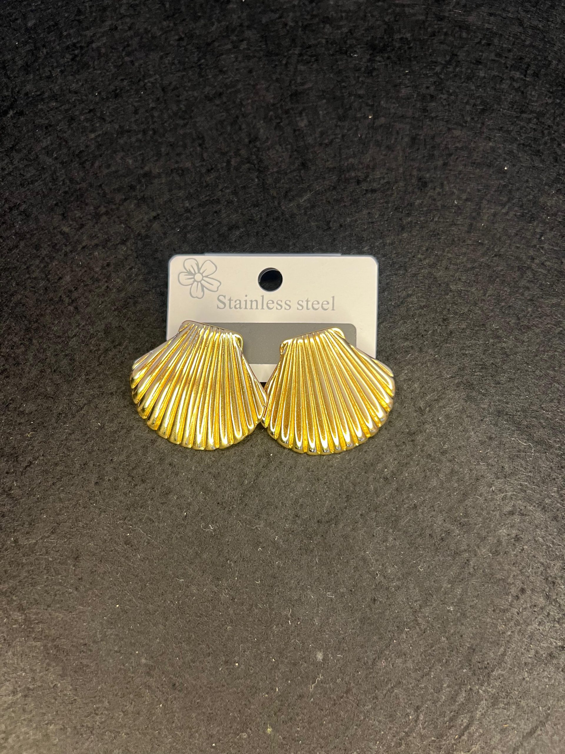 Striking medium-sized sea shell shaped stud earrings in gleaming gold stainless steel. Lightweight, hypoallergenic, and perfect for adding a touch of beachy elegance to any outfit.