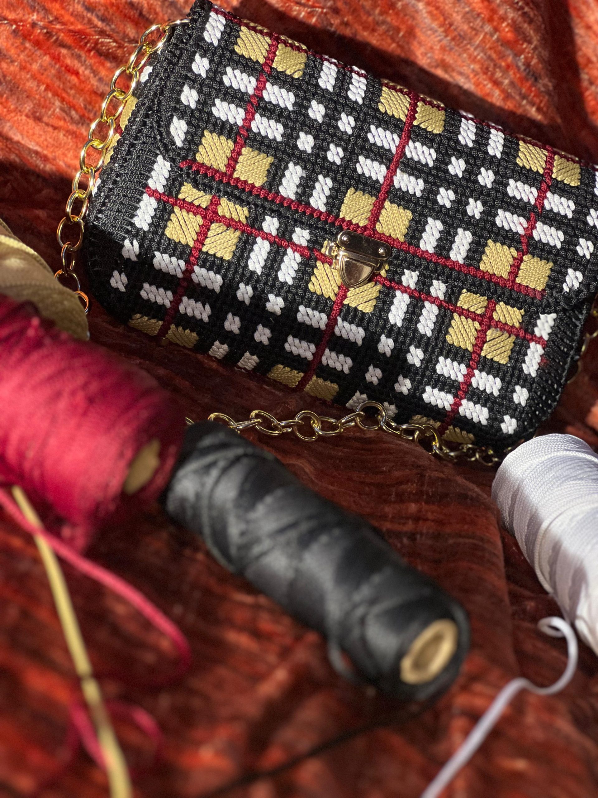 Discover timeless sophistication with this exquisite handwoven Burberry pattern chain bag – a stunning fusion of classic design and artisanal craftsmanship. Each bag is meticulously handwoven to recreate the iconic Burberry check pattern using rich black base threads interwoven with crisp white, luxurious gold, and bold red accents, creating a sophisticated and eye-catching checkered effect.