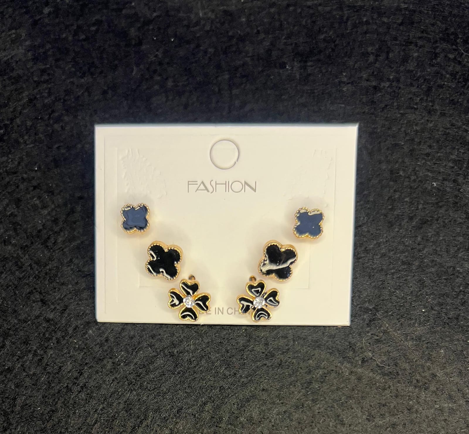 - 1 pair of black & white flower clover studs with clear crystal centers for extra sparkle