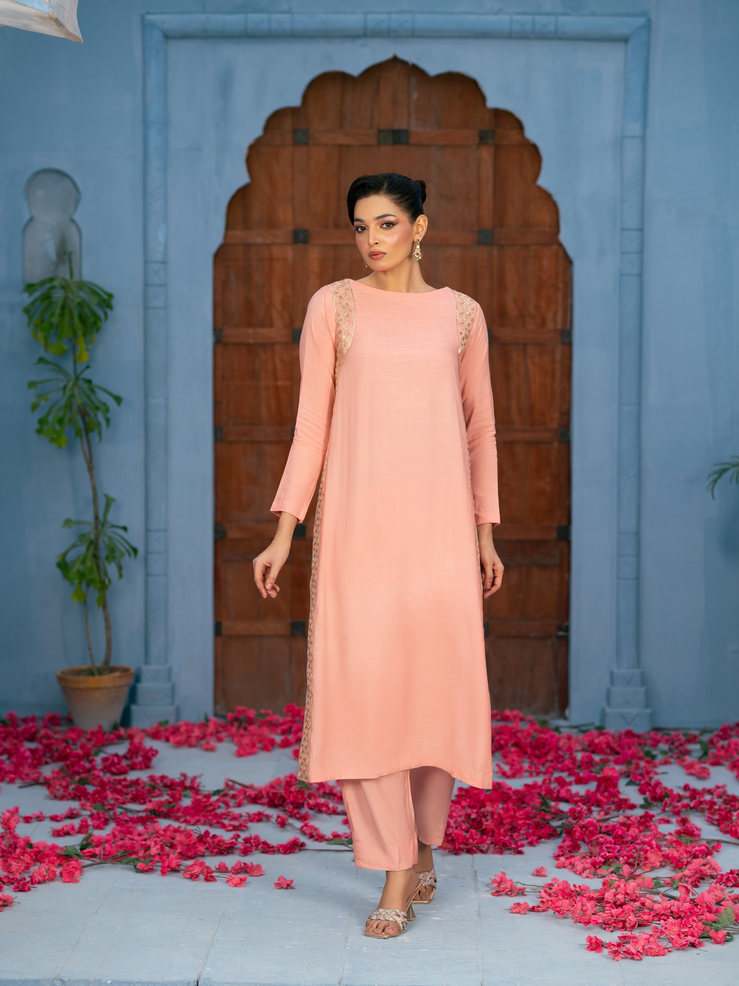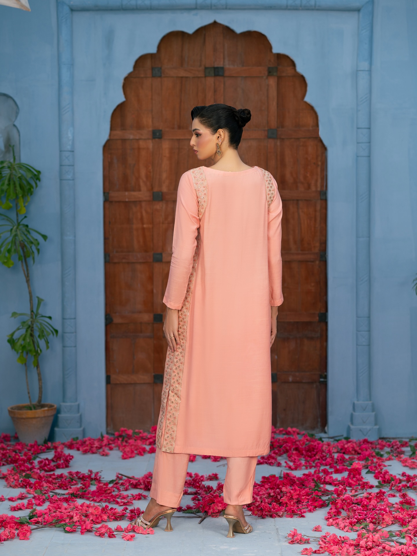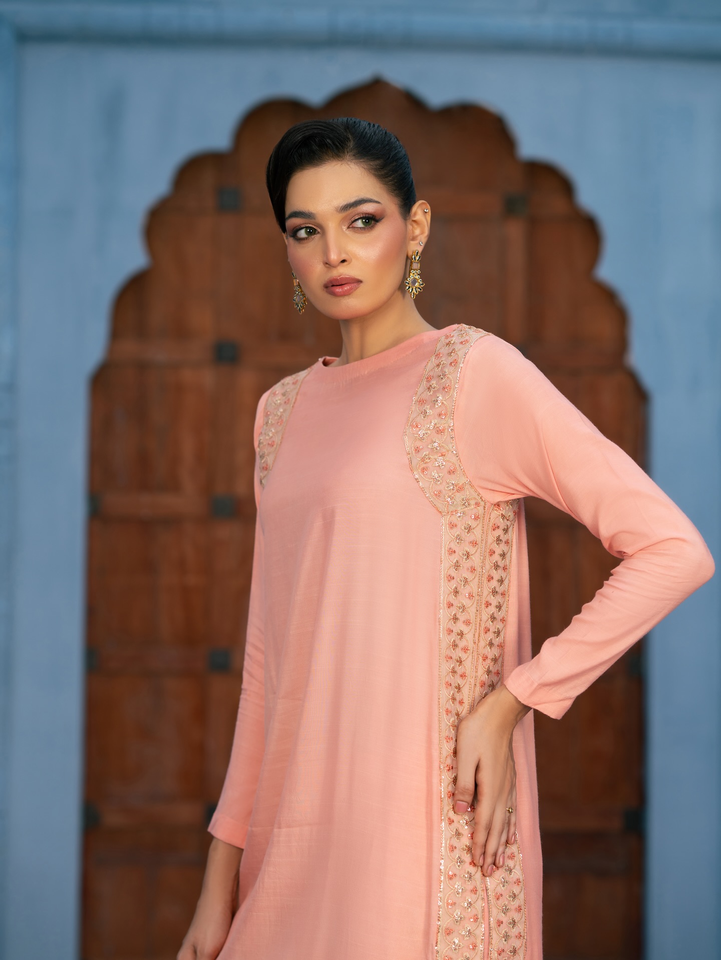 - Shirt: Luxurious peach raw silk fabric with beautiful embroidered lace detailing running along the sides (side slits), adding texture and elegance. The round neckline and three-quarter sleeves create a classic, flattering silhouette.