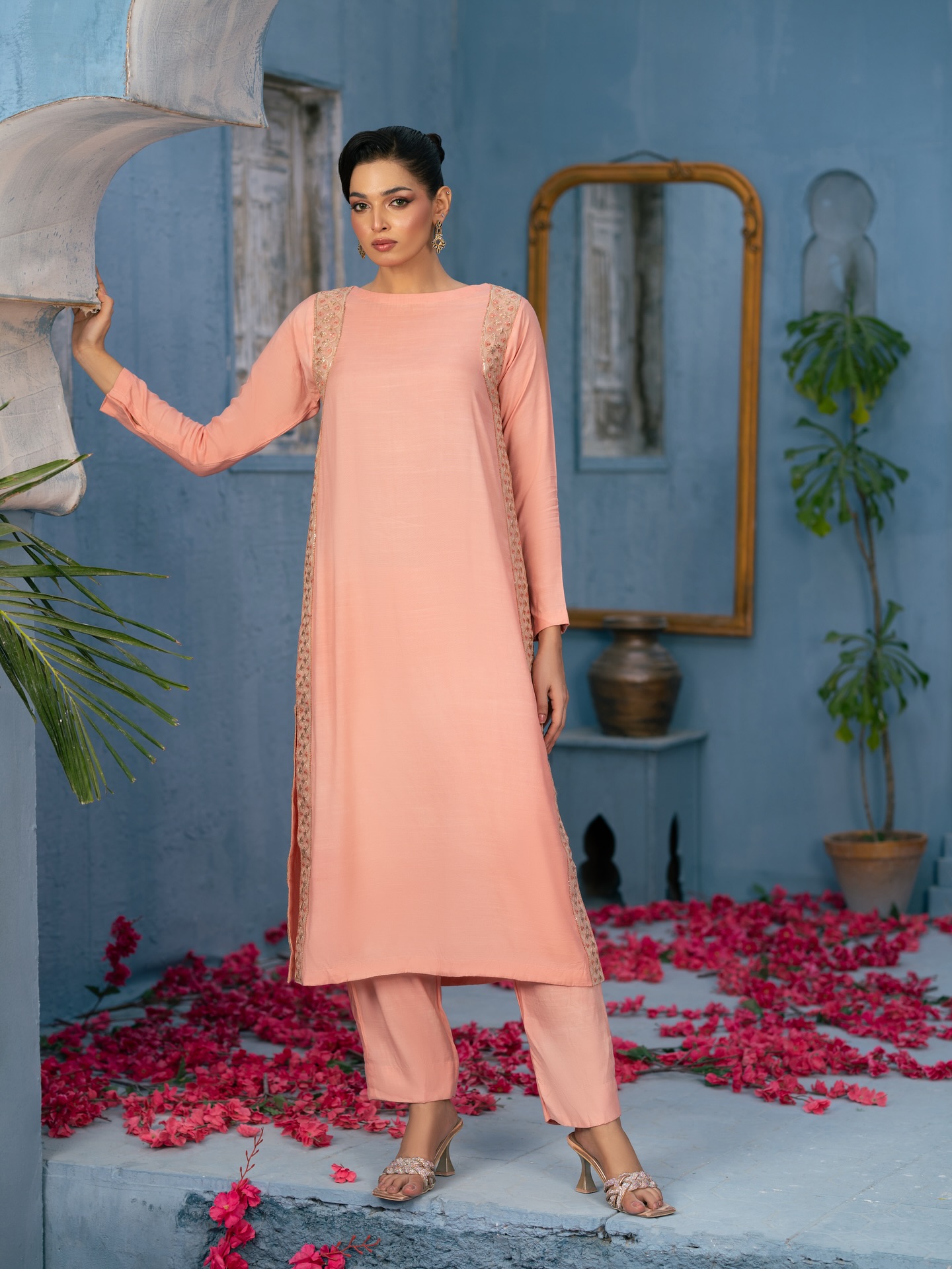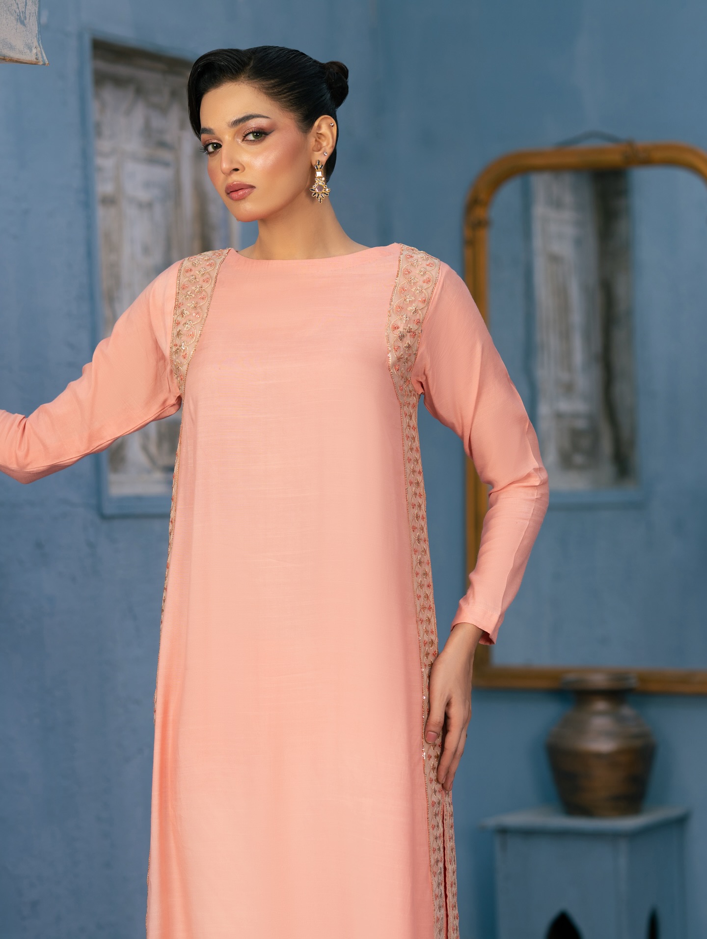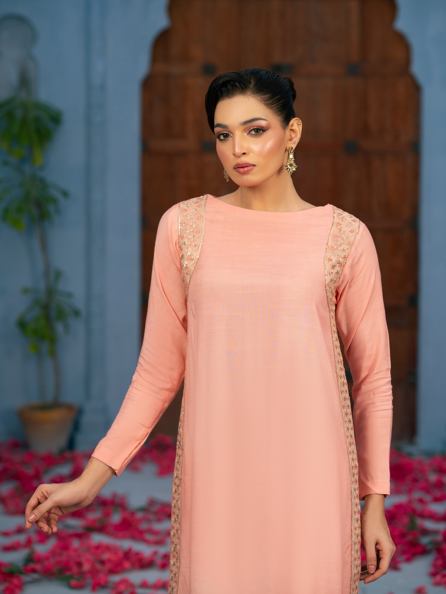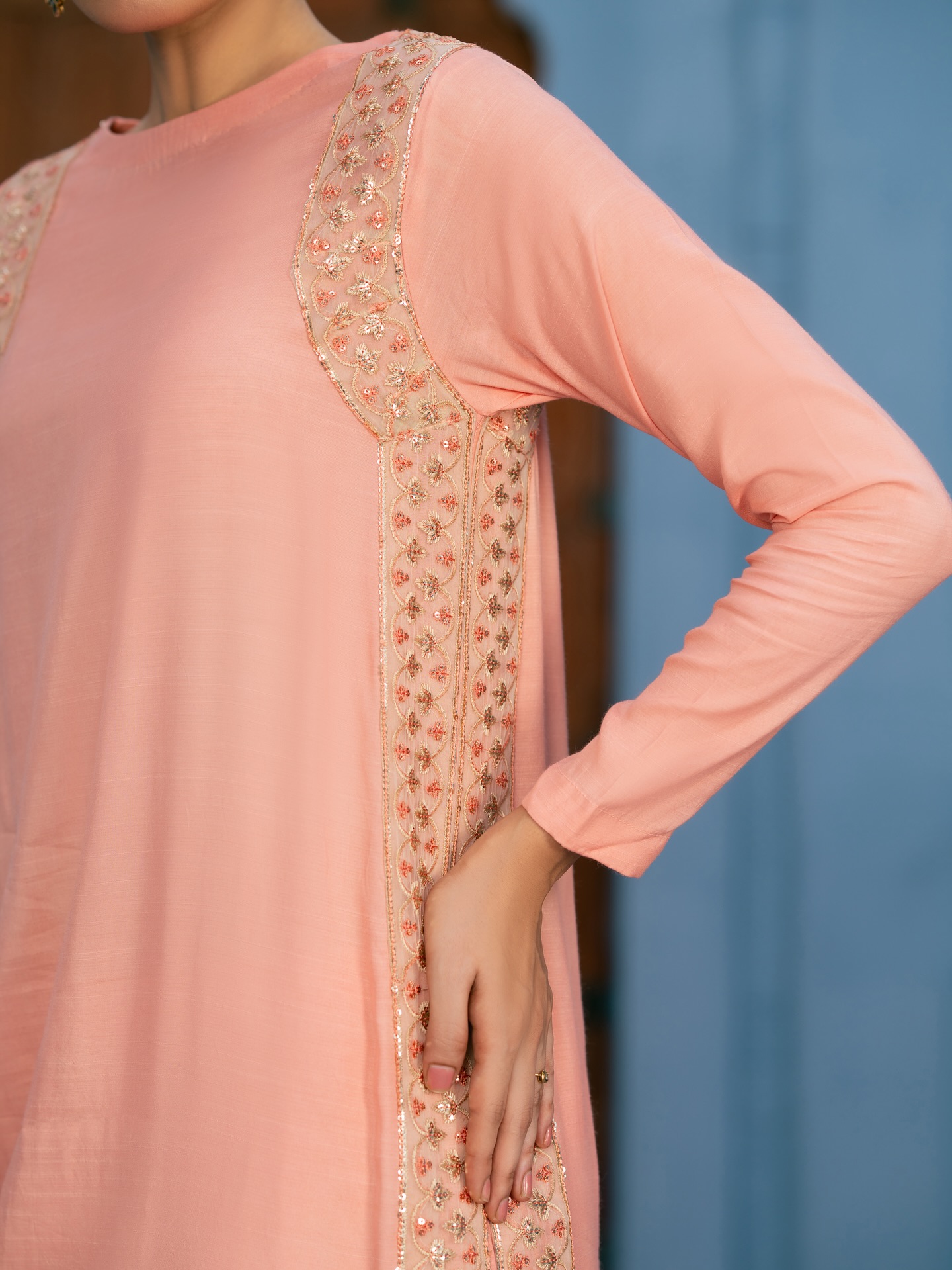 - Shirt: Luxurious peach raw silk fabric with beautiful embroidered lace detailing running along the sides (side slits), adding texture and elegance. The round neckline and three-quarter sleeves create a classic, flattering silhouette.