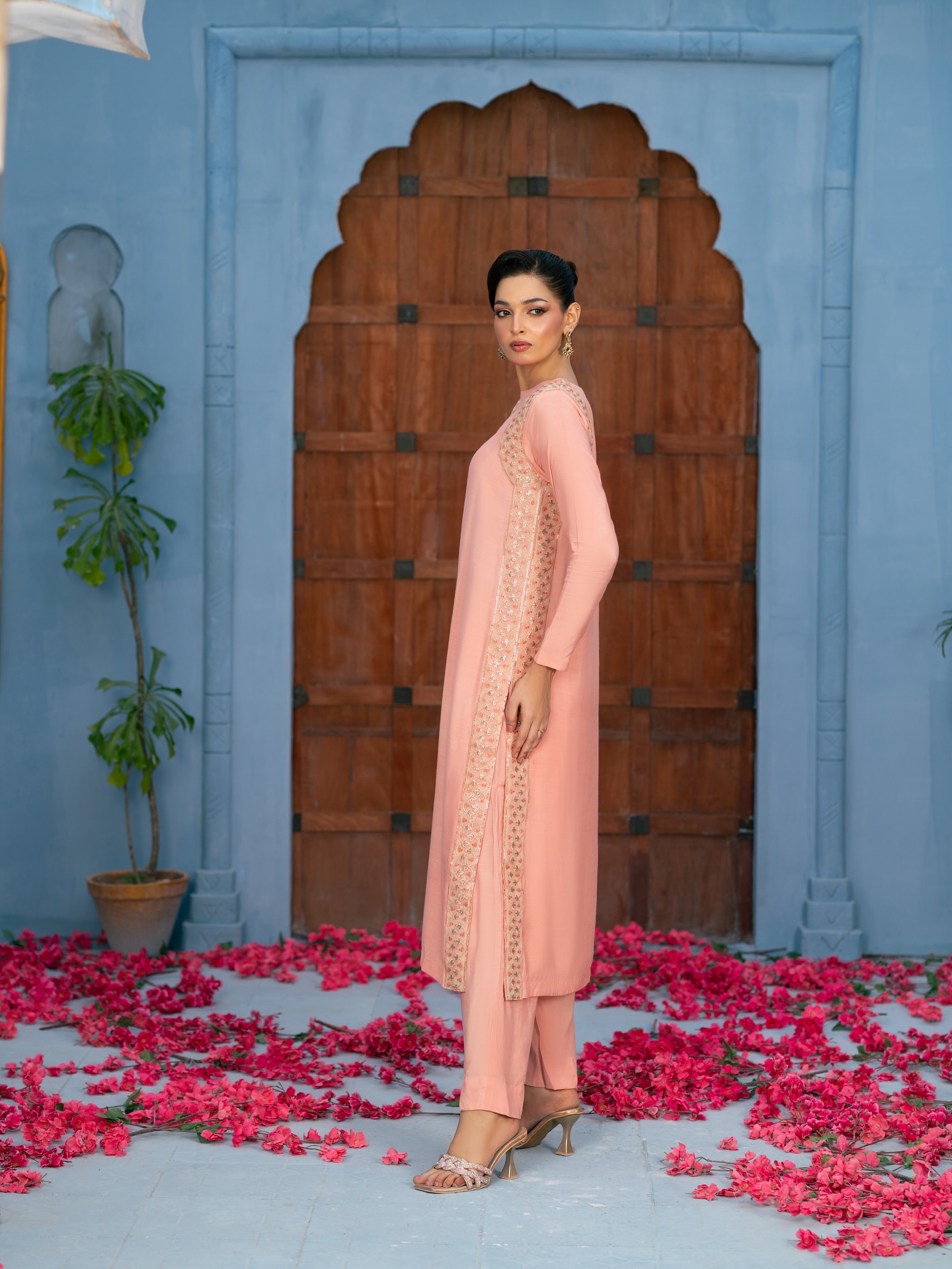 Embrace soft sophistication with the Peach raw silk suit – a gentle masterpiece that combines luxurious fabric with delicate lace embroidery for timeless, understated beauty.