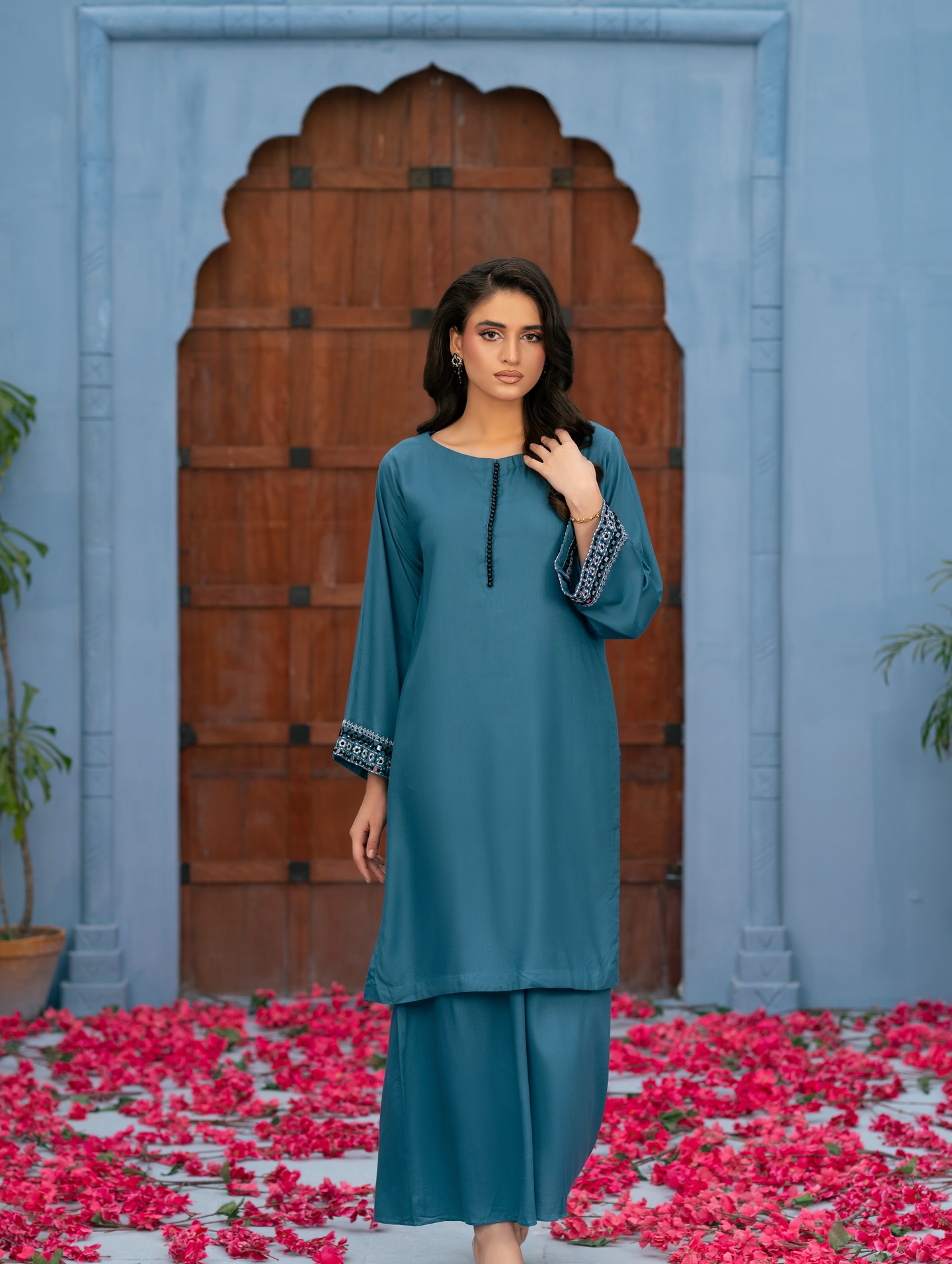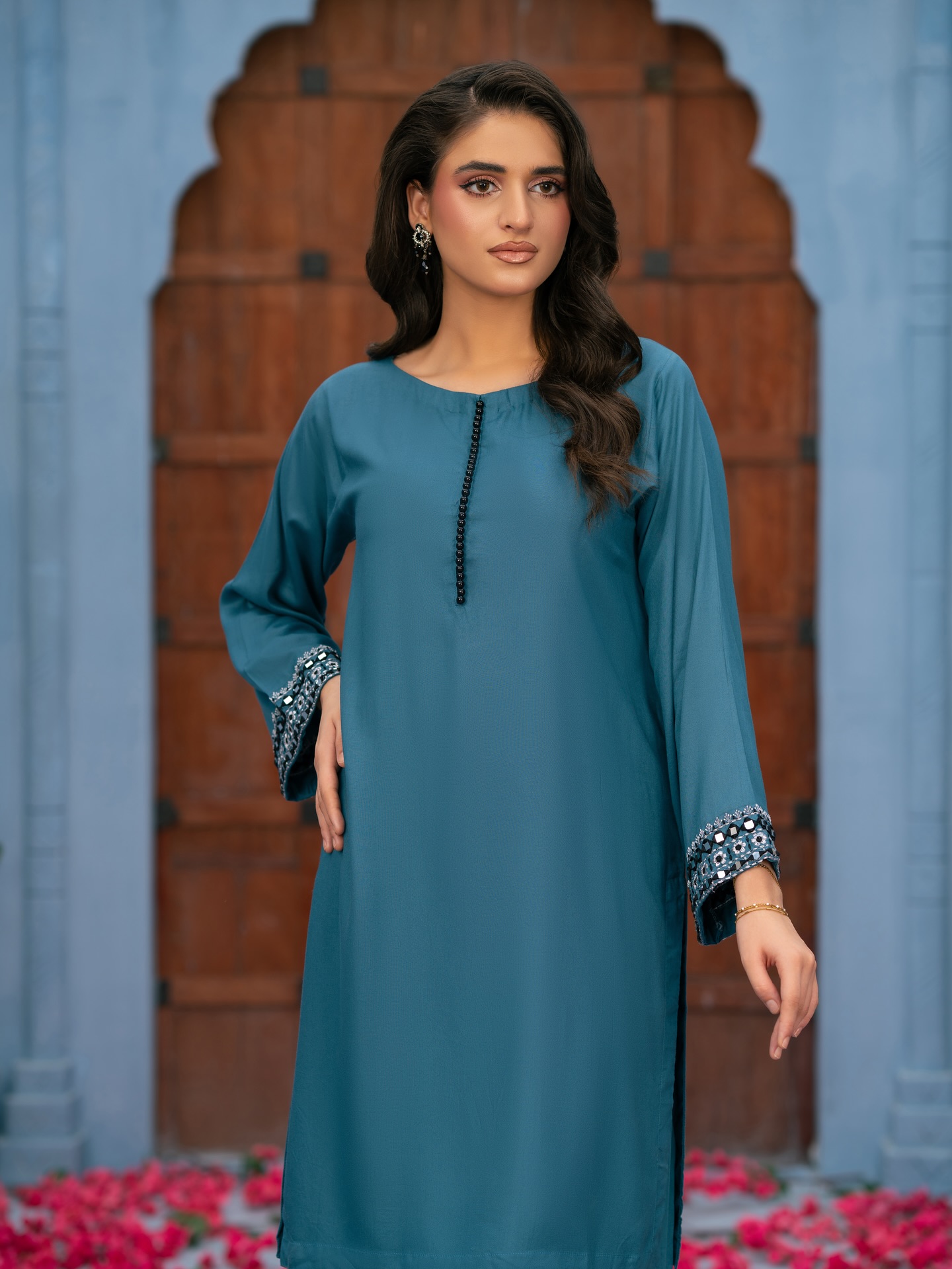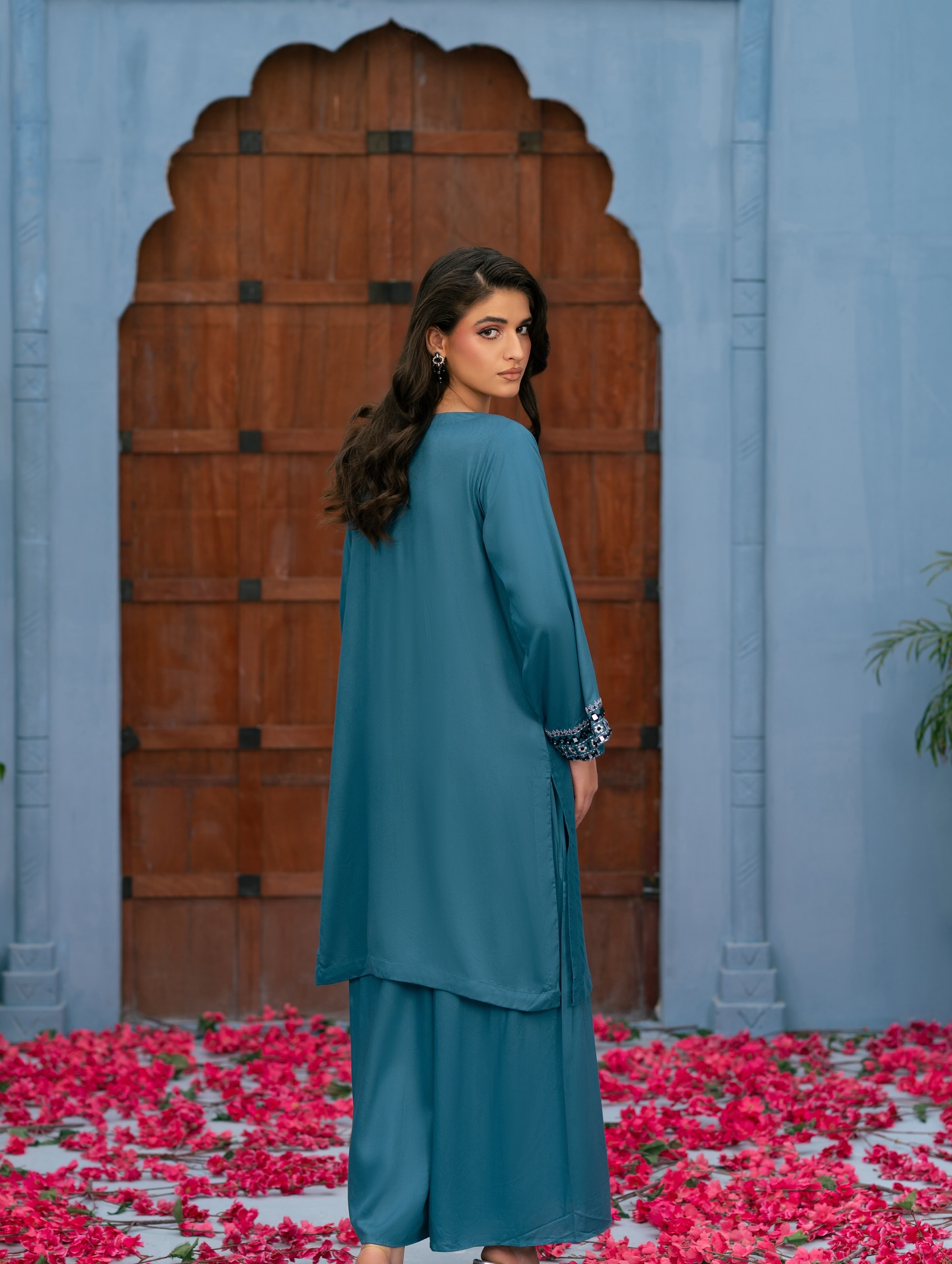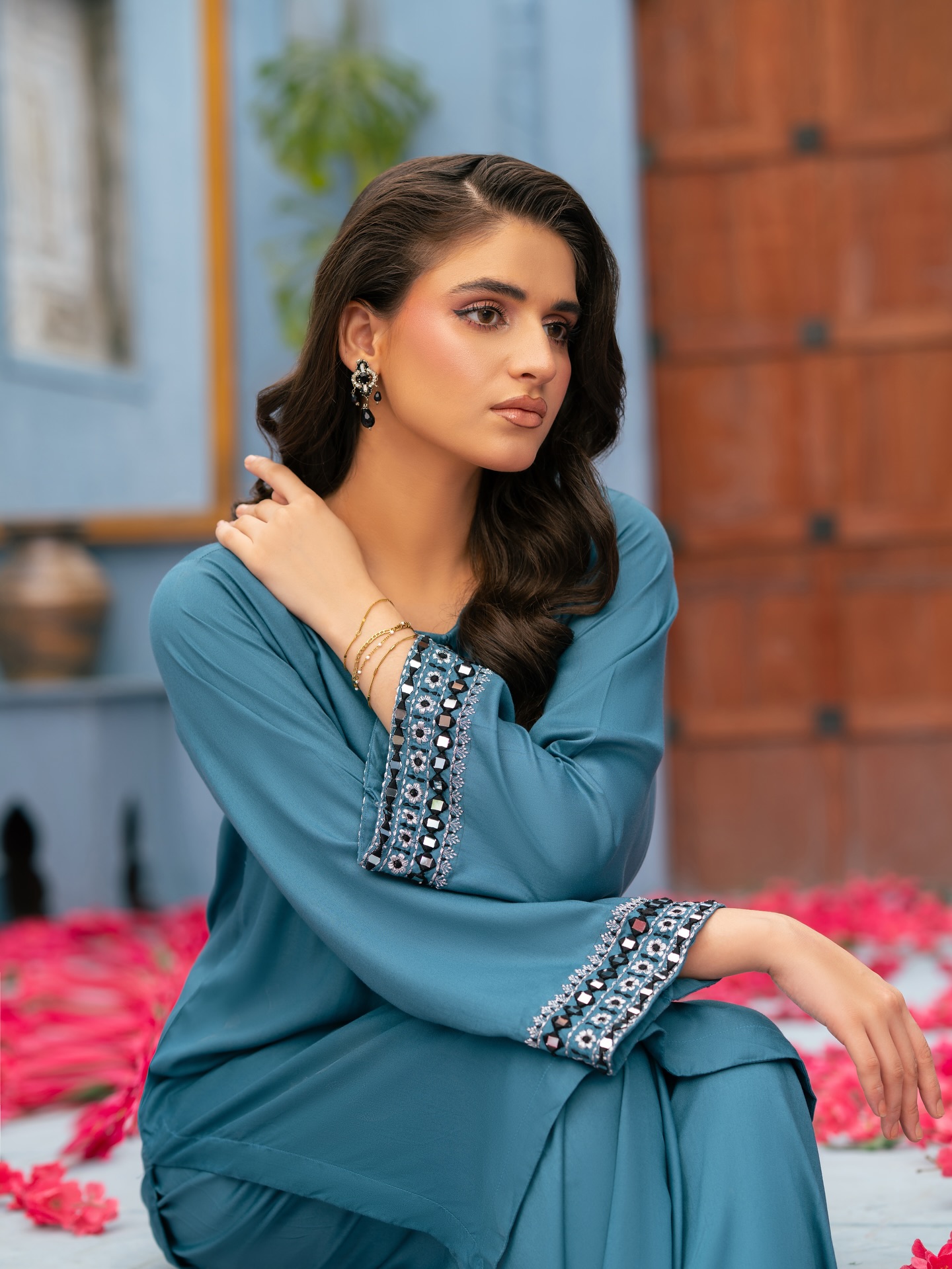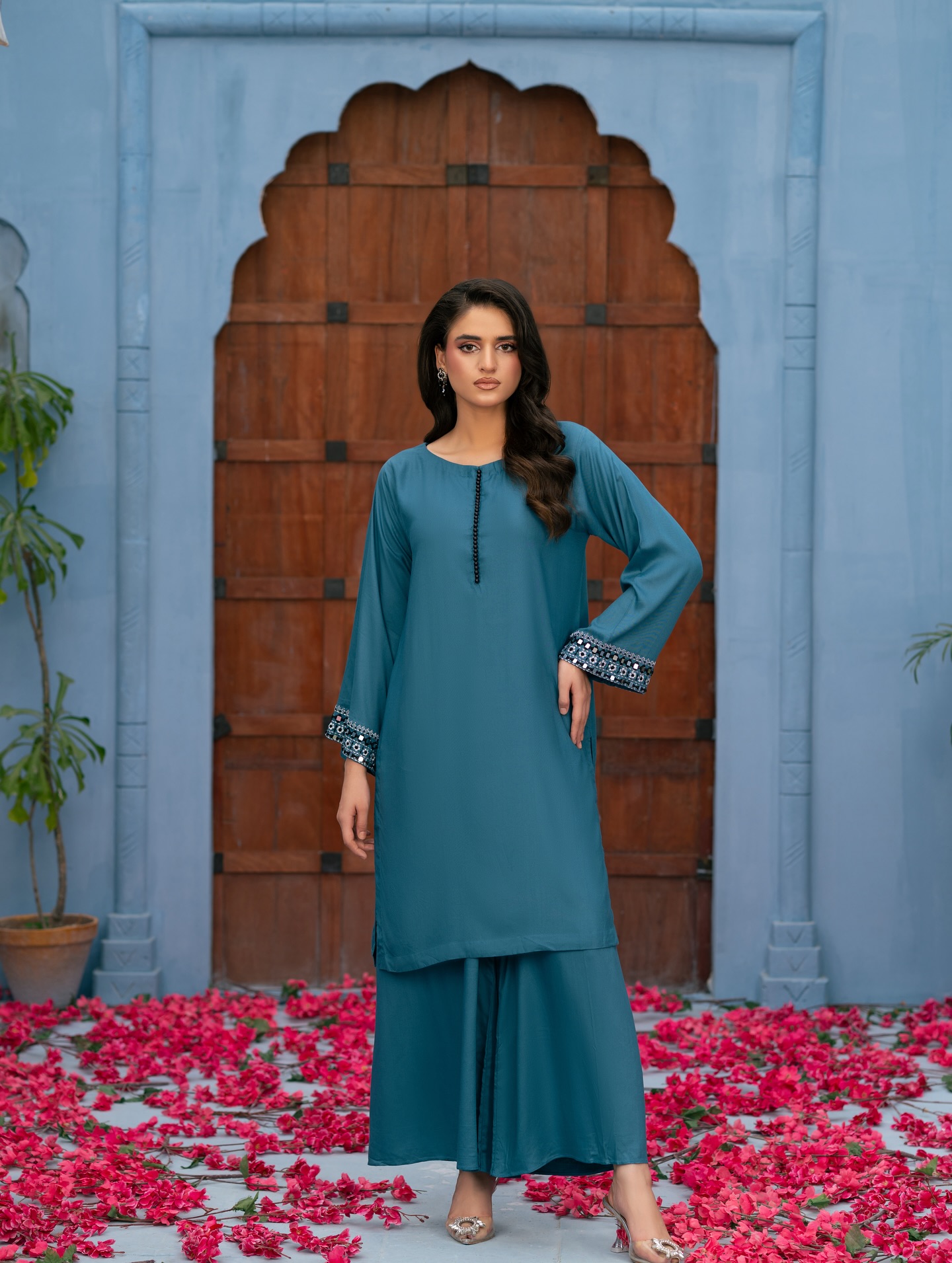 Teal | Mirror & Pearl Embroidered Viscose Suit with Stunning Sleeve Details